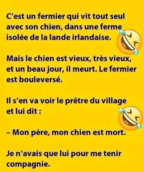 C’est un fermier qui vit tout seul avec son chien, dans une ferme isolée de la lande irlandaise. Mais le chien est vieux, très vieux, et un beau jour, il meurt. Le fermier est bouleversé. Il s’en va voir le prêtre du village et lui dit …Mon père, mon chien est mort….. Lire la suite … Lire la suite